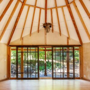At the heart of the space is a beautiful round wooden temple, a warm and grounding structure that naturally enhances acoustics. This makes it particularly well suited to sound healing, chanting and immersive auditory experiences, where resonance and tone can fully unfold and be felt.